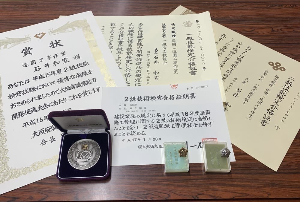 1級造園技能士、2級造園施工管理技士を取得し、造園技能士を取得の際に、優秀賞として表彰して頂きました。